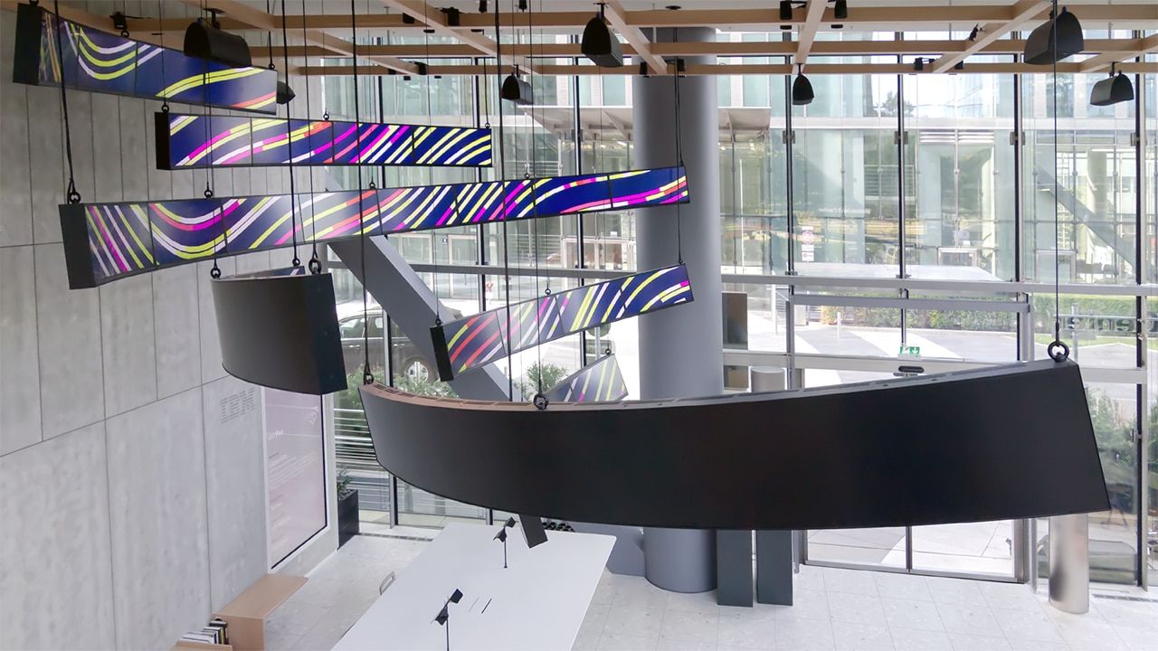 Commissioned by IBM, onformative was invited to develop »FLUX«, a permanent installation for the new IBM Watson IoT Headquarters in Munich. Nested in polished steel casings, thirty-two curved screens span over eight ribbon displays. Inspired by the shape of IBM Watson, »FLUX« is composed of dynamic visuals based on complex IoT data, various sensor inputs and weather forecasting. The data-driven visual content moves and clusters based on the real-time input, reflecting the innovation, growth and creative power of technology.